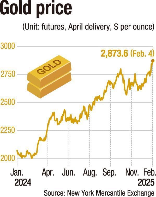 Gold just flexed to an all-time high of $2,844.56 (4.11 million won) per ounce on Tuesday, as investors scrambled for safe-haven assets amid rising U.S.-China tariff tensions.